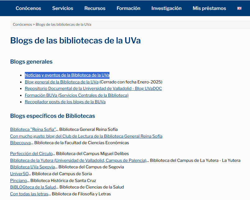 - Por último señalar que la BUVa, también dispone de una serie de blogs, donde se explica de manera más amplia diferentes cuestiones de interés, todo ello relacionado con nuestros servicios y recursos: